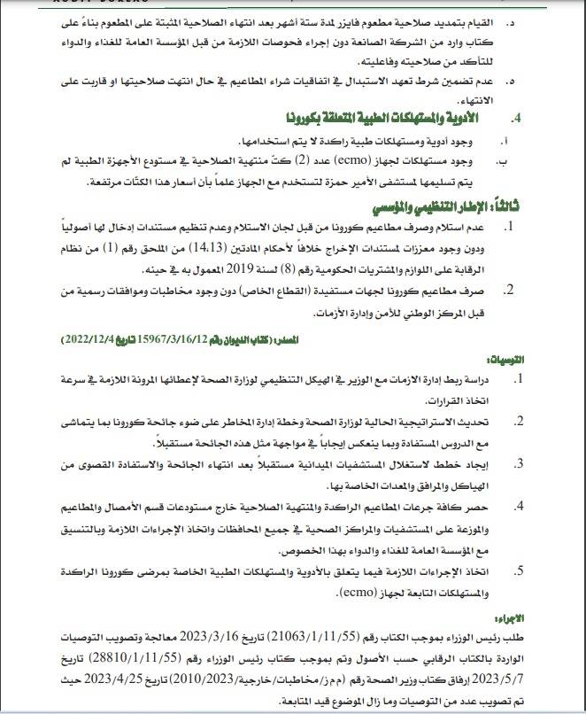 وبين أنه تم استئجار عدد من الأسرة في المستشفيات الخاصة لمعالجة مرضى كورونا خلال نفس الفترة بمبلغ 23,985,632 دينار بمتوسط نسبة اشغال (34%) لاسرة العزل و (66%) لاسرة العناية المشددة على الرغم من انخفاض نسبة الاشغال في المستشفيات الميدانية الامر الذي ادى الى تحمل نفقات مضاغفة.
