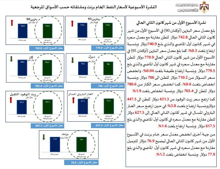 تباينت أسعار المشتقات النفطية عالميا خلال الأسبوع الأول من شهر كانون الثاني الحالي، مقارنة مع معدل أسعارها للشهر الماضي، بحسب بيانات أعلنتها وزارة الطاقة والثروة المعدنية اليوم الثلاثاء.