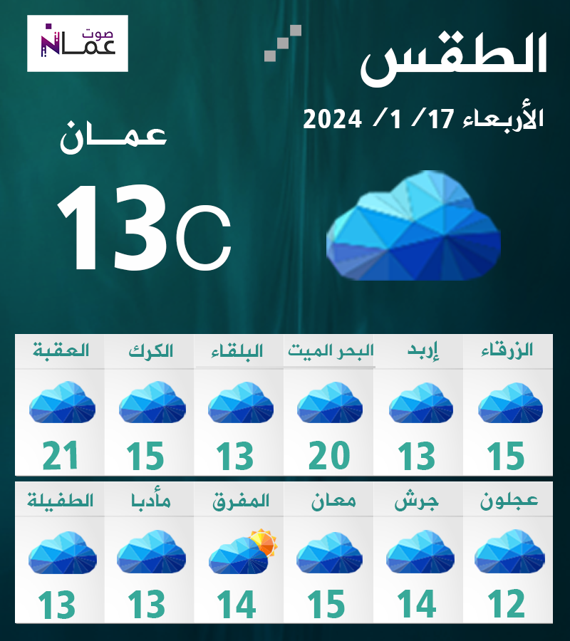 ويطرأ يوم الخميس، ارتفاع قليل في درجات الحرارة، وتكون الأجواء باردة نسبيا في أغلب المناطق، ودافئة نسبيا في الأغوار والبحر الميت والعقبة، مع ظهور بعض الغيوم على ارتفاعات مختلفة، وتكون الرياح شرقية خفيفة السرعة.