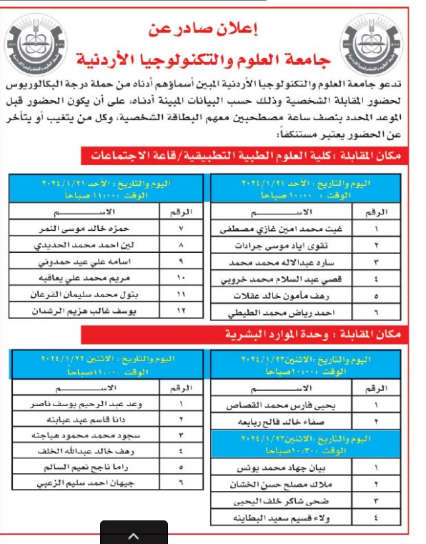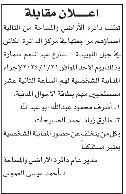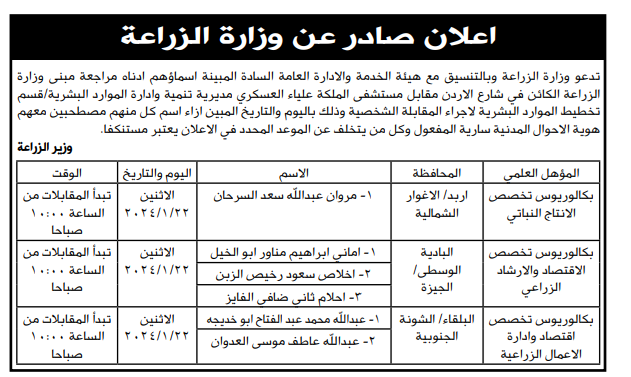 دعت وزارات ومؤسسات حكومية، اليوم الأربعاء، التالية أسماؤهم لإجراء المقابلات الشخصية لغايات استكمال إجراءات التعيين.