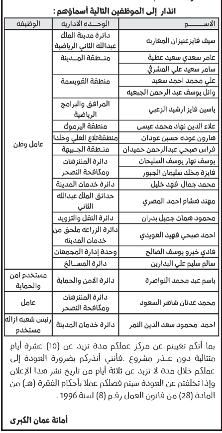 وجهت أمانة عمّان الكبرى إنذاراً لـ20 موظفا، بالفصل من العمل في حال تخلفهم عن العودة لعملهم.