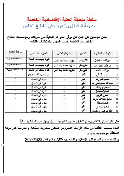 أعلنت سلطة منطقة العقبة الاقتصادية الخاصة /مديرية التشغيل والتدريب في القطاع الخاص عن توفر شواغر لدى شركات ومؤسسات القطاع الخاص في المنطقة حسب المهن والمتطلبات التالية .