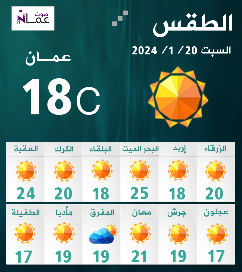 يطرأ ارتفاع طفيف في درجات الحرارة نهار اليوم السبت؛ وتكون الأجواء مائلة للبرودة قليلاً في المرتفعات الجبلية العالية، ودافئة نسبياً في باقي مناطق الأردن، والرياح جنوبية شرقية خفيفة السرعة.