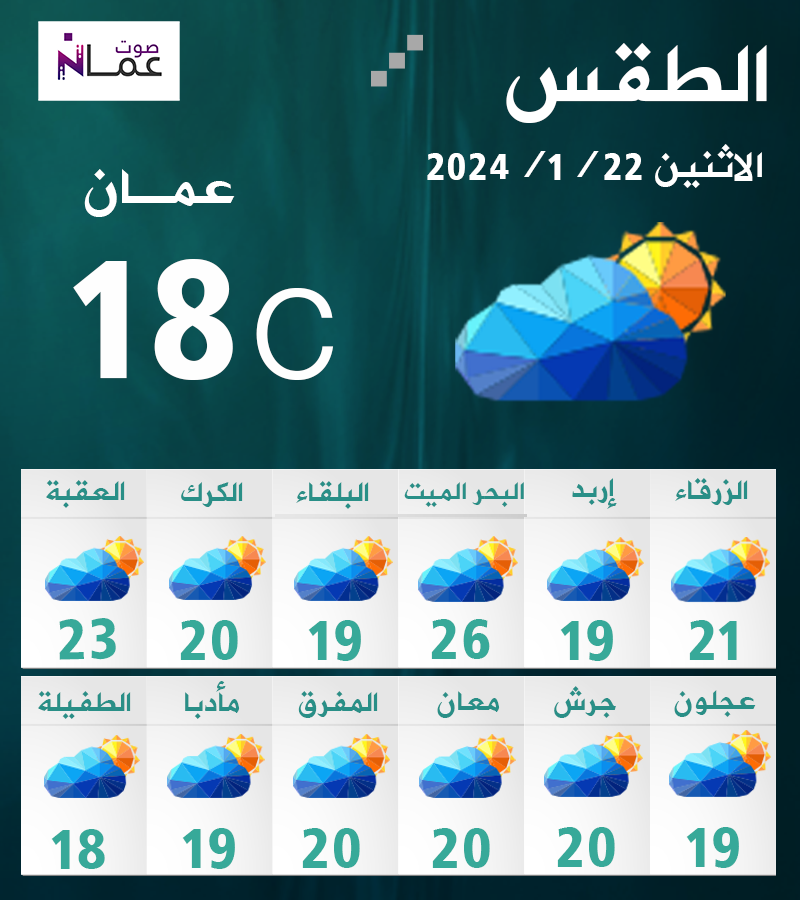 تبقى الأجواء اليوم الاثنين لطيفة الحرارة في أغلب مناطق الأردن، ودافئة في الأغوار والبحر الميت والعقبة، مع ظهور بعض الغيوم على ارتفاعات متوسطة وعالية، والرياح جنوبية غربية معتدلة السرعة تنشط أحيانا.