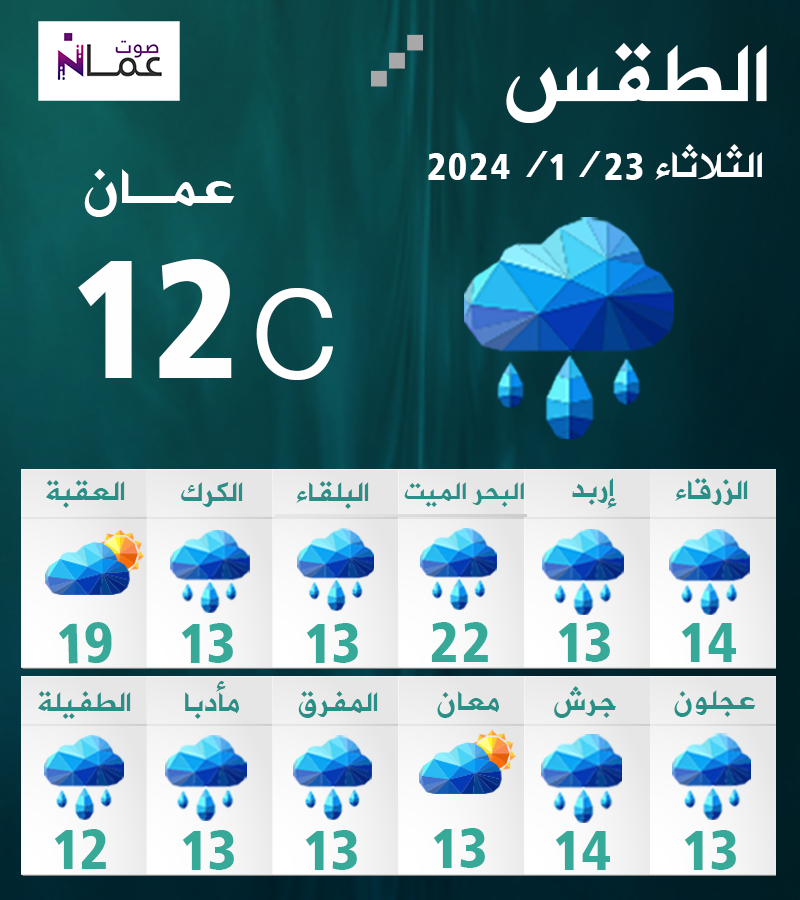 ويطرأ انخفاض ملموس في درجات الحرارة؛ وتسود أجواء باردة وغائمة جزئياً إلى غائمة، وتهطل باذن الله زخات من المطر في شمال ووسط الأردن وأجزاء محدودة من المناطق الجنوبية الغربية، والرياح غربية معتدلة السرعة تنشط بين الحين والآخر.