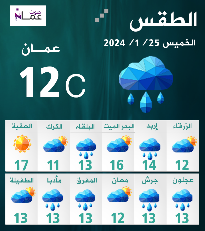 تبقى الأجواء اليوم الخميس، باردة وغائمة جزئياً في أغلب مناطق الأردن، ويتوقع بإذن الله هطول زخات خفيفة من المطر على فترات في أجزاء من شمال المملكة، والرياح جنوبية غربية معتدلة السرعة.