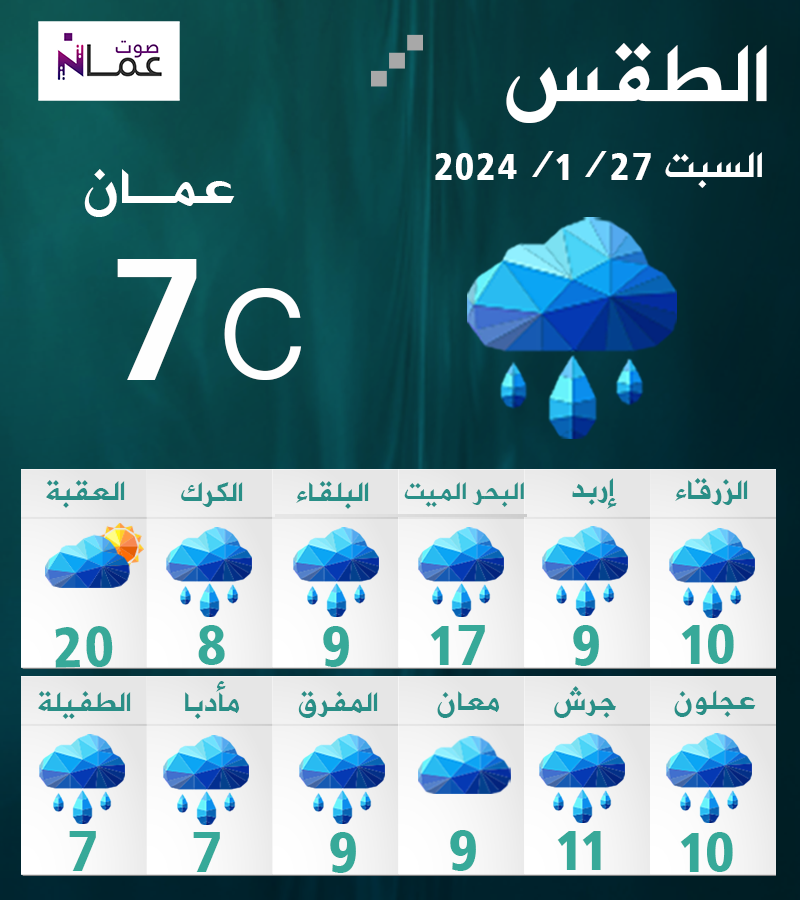 تبقى المملكة اليوم السبت، تحت تأثير الكتلة الهوائية الباردة الرطبة، وتستمر الأجواء الباردة والماطرة بين الحين والآخر في شمال ووسط الأردن، وأجزاء من المناطق الجنوبية الغربية، تكون في ساعات الصباح غزيرة أحيانا في بعض المناطق، قد يصحبها الرعد وتساقط حبات البرد.