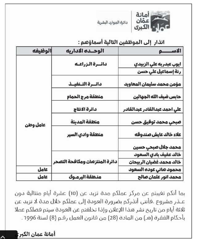وجهت أمانة عمّان الكبرى إنذارات بالفصل من العمل لموظفين، في حال تخلفهم عن العودة لعملهم.