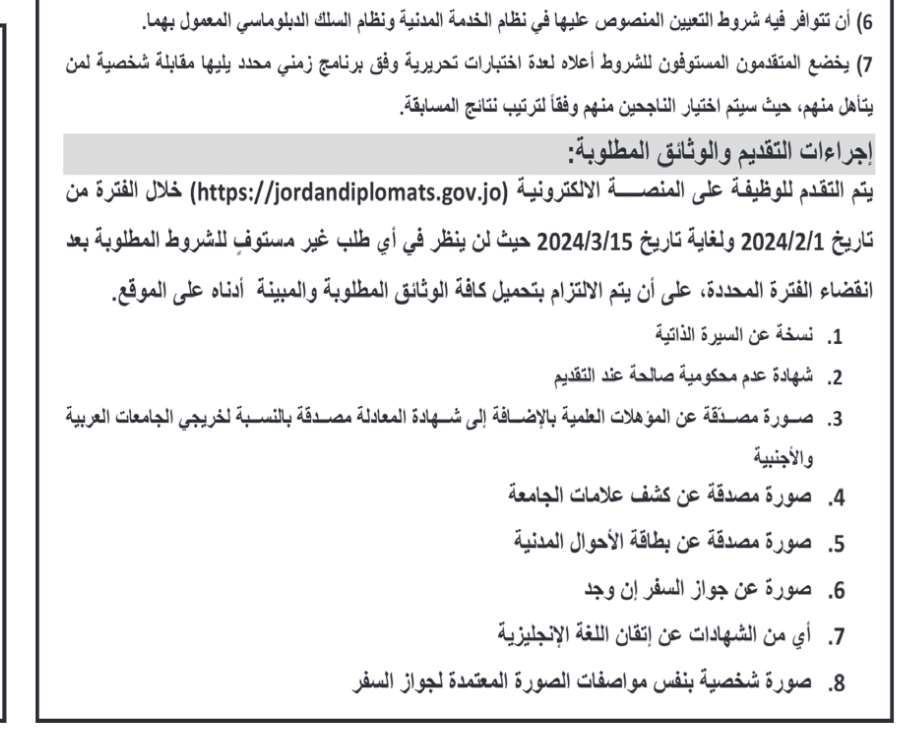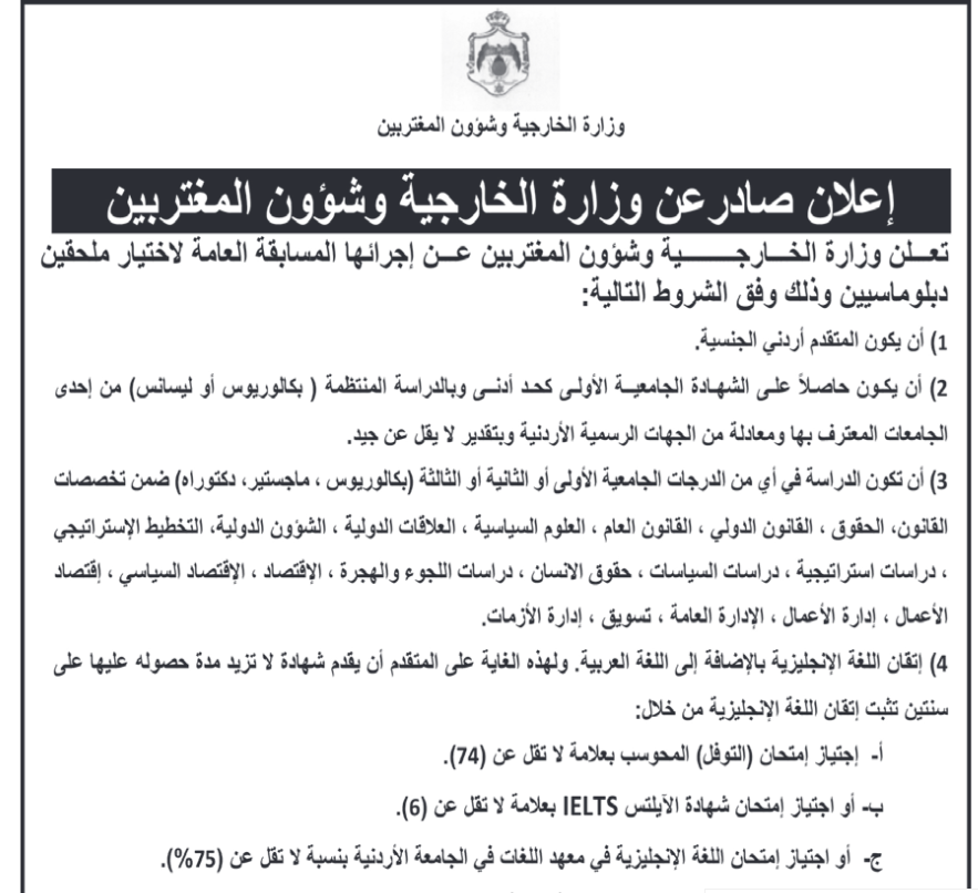 أعلنت وزارة الخارجية وشؤون المغتربين عن إجرائها المسابقة العامة لاختيار ملحقين دبلوماسيين.
