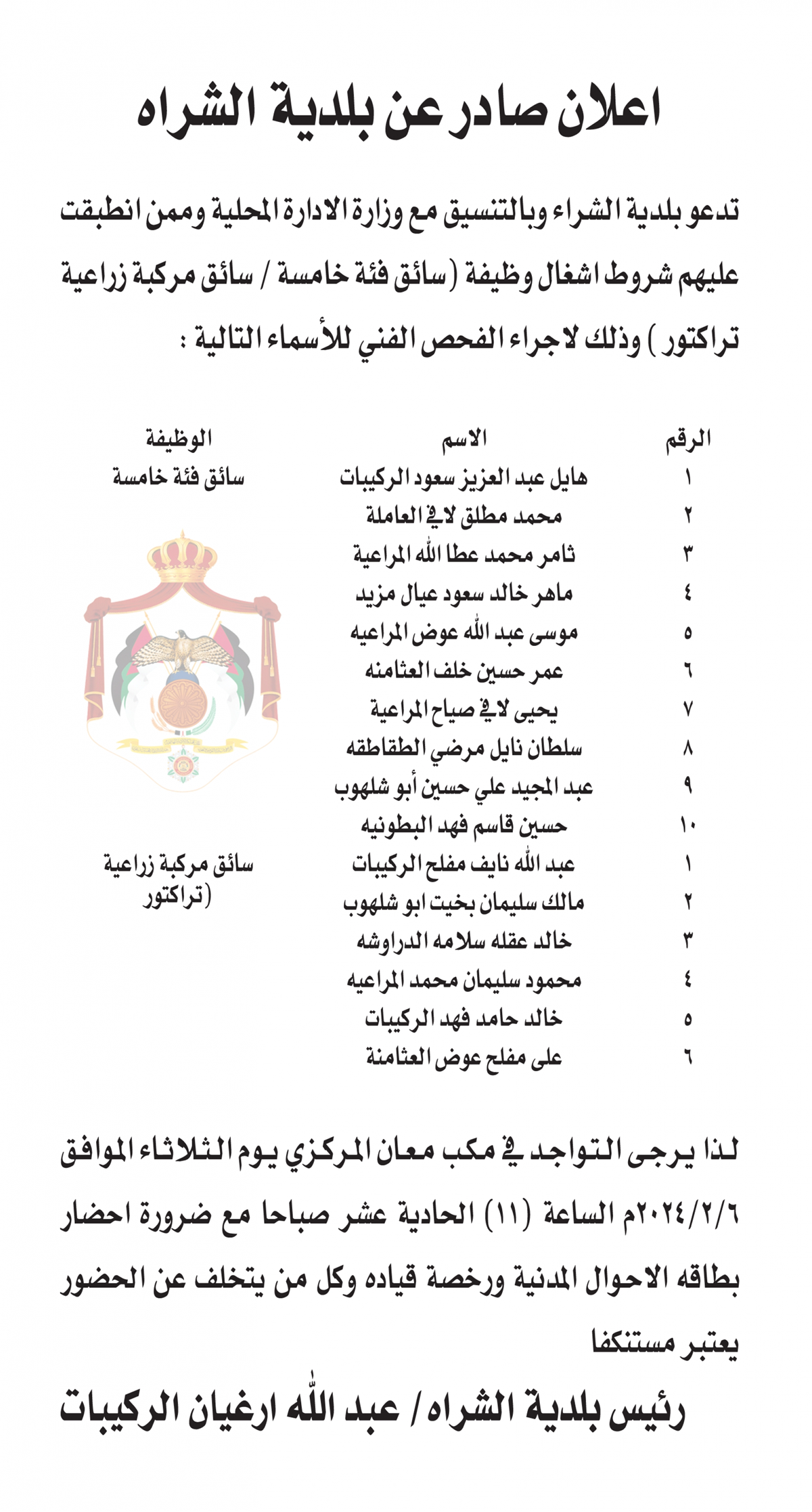 دعت بلدية الشراه وبالتنسيق مع وزارة الادارة المحلية وديوان الخدمة المدنية التالية أسماؤهم لاجراء الفحص الفني والعملي لغايات تعبئة وظيفة سائقين .