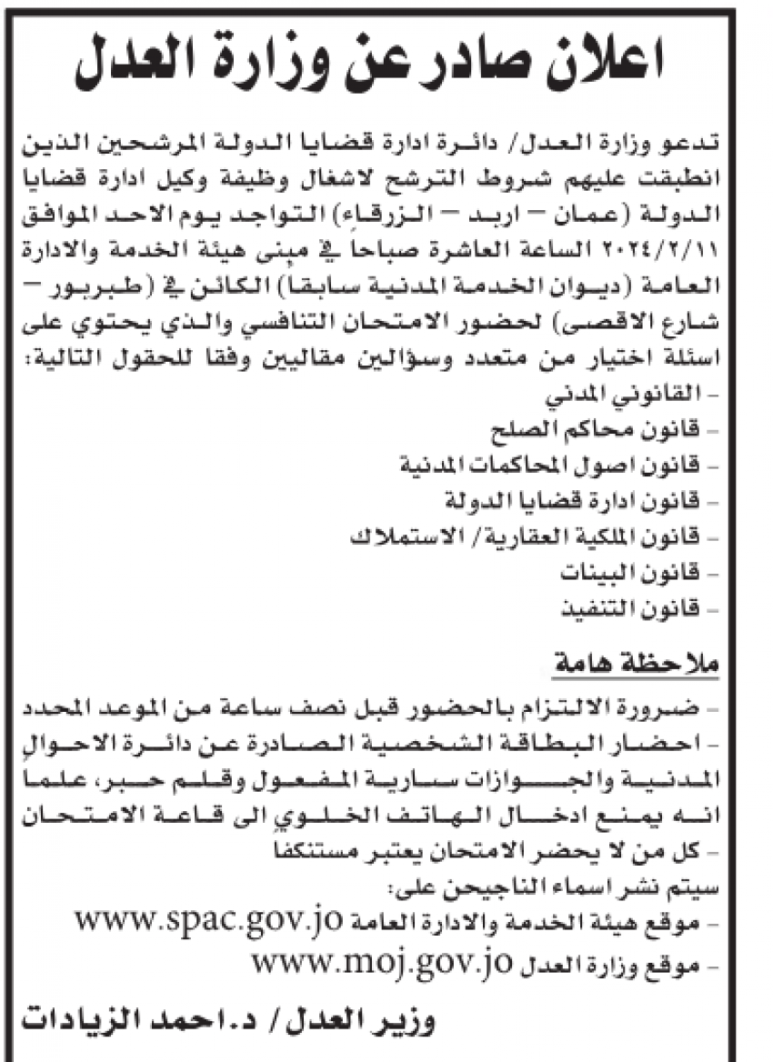 دعت وزارة العدل/ دائرة إدارة قضايا الدولة المرشحين الذين انطبقت عليهم شروط الترشح لاشغال وظيفة وكيل إدارة قضايا الدولة لحضور الامتحان التنافسي.