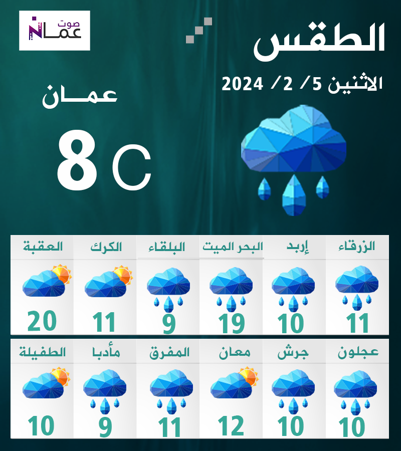 تبقى الأجواء اليوم الاثنين باردة في أغلب مناطق الأردن، وغائمة جزئياً إلى غائمة في شمال ووسط المملكة، مع هطول زخات من المطر على فترات في المناطق الشمالية والوسطى الغربية من المملكة، وأجزاء محدودة من المناطق الشرقية تكون على شكل زخات خفيفة، والرياح جنوبية غربية معتدلة السرعة تنشط أحياناً.