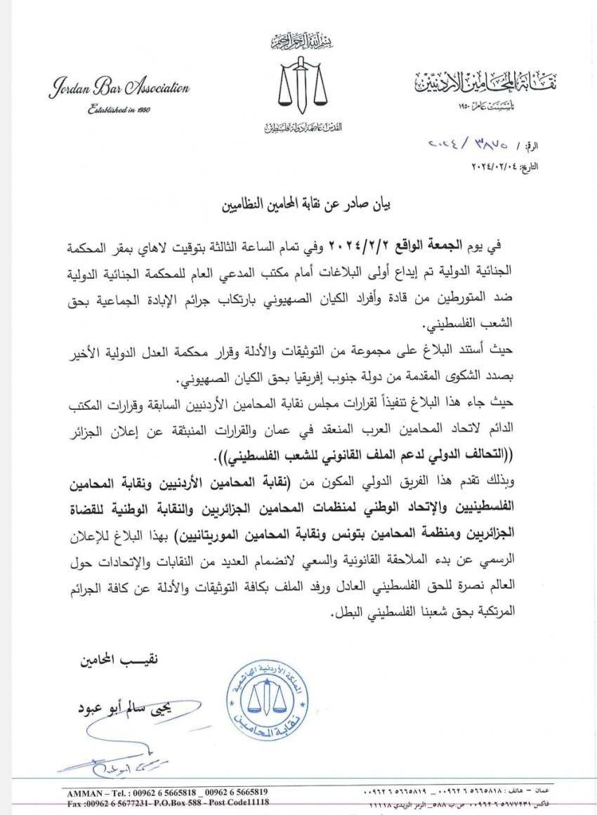 تقدمت نقابة المحامين الاردنيين إلى جانب نقابات ومنظمات حقوقية عربية، ببلاغ للمدعي العام للمحكمة الجنائية الدولية بحق قادة وأفراد الكيان الصهيوني لارتكابهم جرائم إبادة جماعية بحق الشعب الفلسطيني.