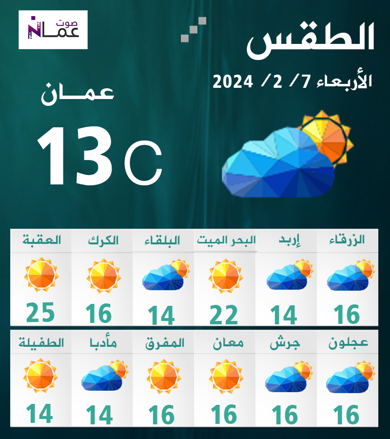 يطرأ ارتفاع قليل في درجات الحرارة اليوم الأربعاء، وتكون الأجواء غالبا مشمسة، وباردة نسبياً في أغلب مناطق الأردن، ومائلة للدفء في الأغوار والبحر الميت والعقبة، والرياح جنوبية شرقية خفيفة السرعة.