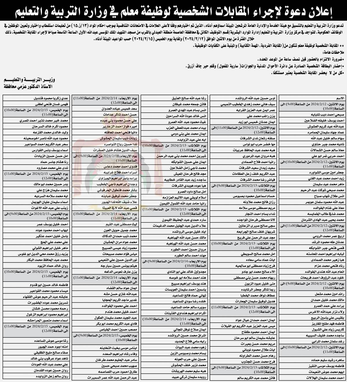 دعت وزارة التربية والتعليم اليوم الأربعاء، وبالتنسيق مع هيئة الخدمة والادارة العامة التالية أشخاص لحضور المقابلات الشخصية.