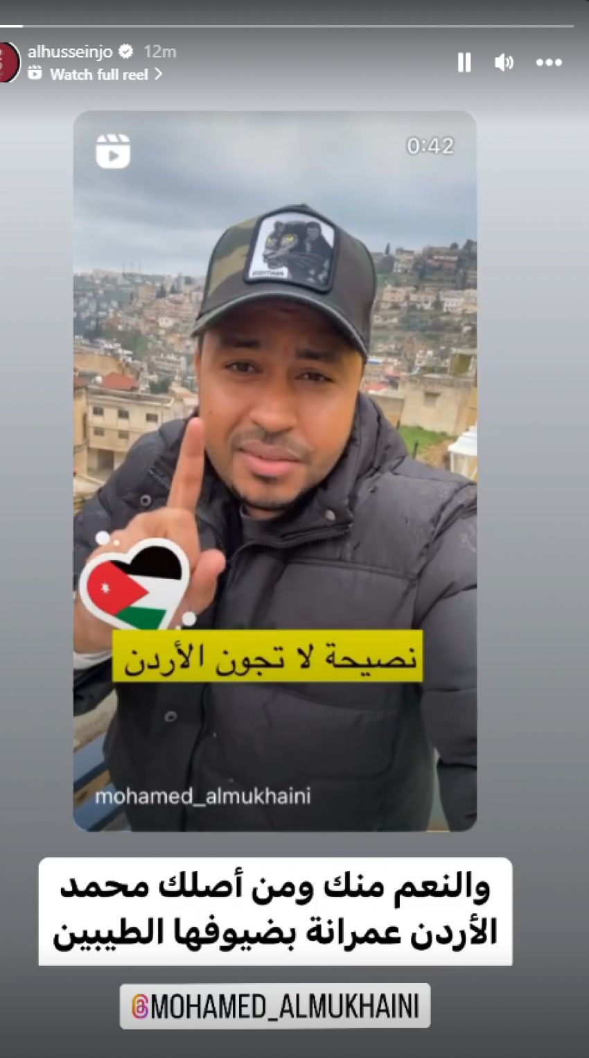 وقال سمو الامير عبر خاصية الستوري في انستجرام بعد مشاركته الفيدو "والنعم منك ومن أصلك محمد الأردن عمرانه بضيوفها الطيبين".