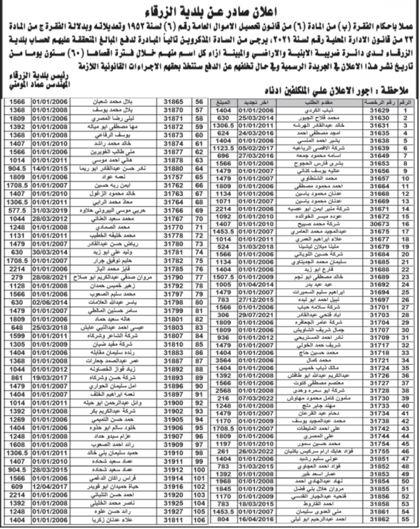 بلدية الزرقاء تطالب مواطنين بسداد أموال مستحقة (أسماء)