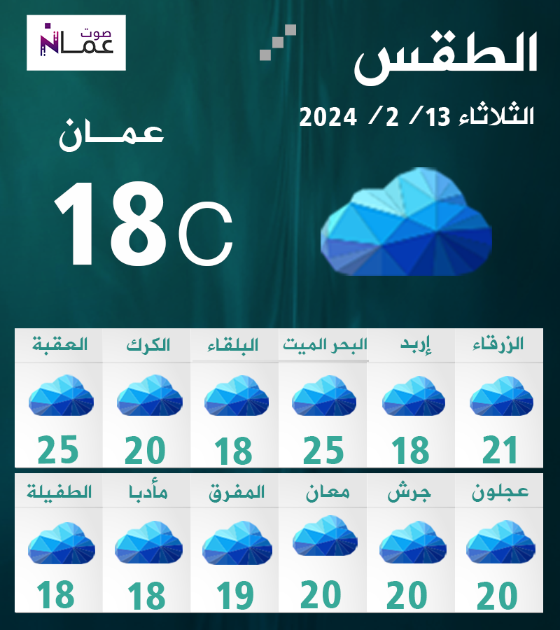 يوم الخميس، تستمر الأجواء باردة وغائمة، مع هطول زخات من المطر في العديد من المناطق، ويتوقع أن تكون في ساعات ما بعد الظهر غزيرة احياناً خاصة في جنوب المملكة ويصحبها الرعد وتساقط حبات البرد، والرياح غربية نشطة السرعة مثيرة للغبار في مناطق البادية.