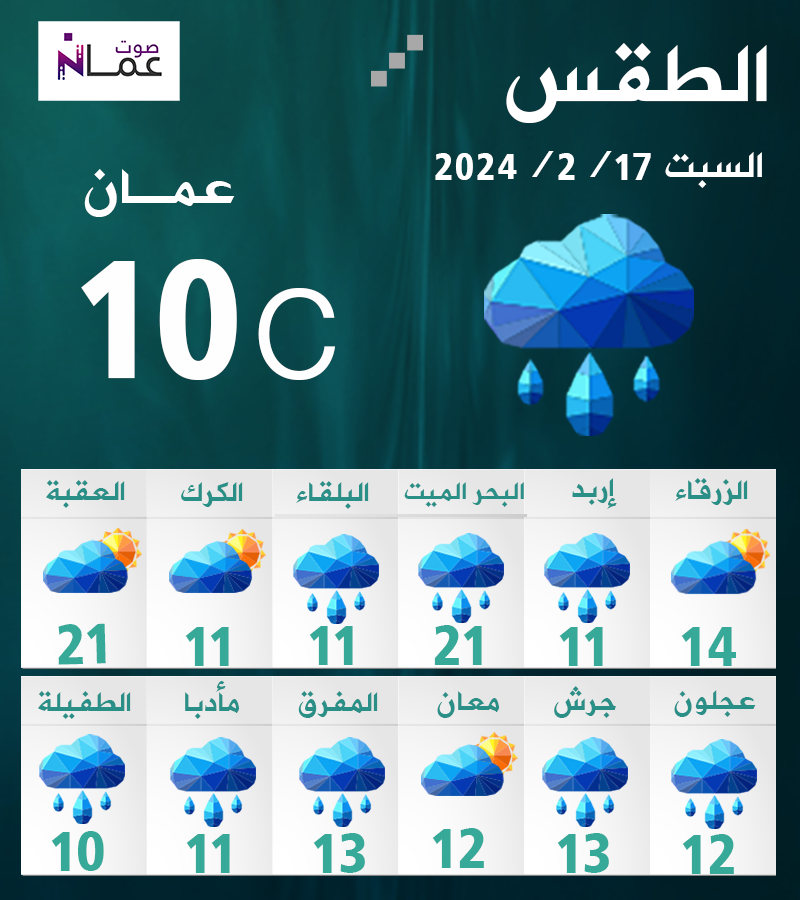 تستمر الأجواء الباردة والغائمة جزئياً إلى غائمة أحيانا اليوم السبت، وتهطل بإذن الله تعالى زخات من المطرعلى فترات في شمال ووسط المملكة، بينما من المحتمل أن تشهد الاجزاء الشرقية والجنوبية الغربية زخات خفيفة من المطر، والرياح غربية إلى شمالية غربية نشطة السرعة.