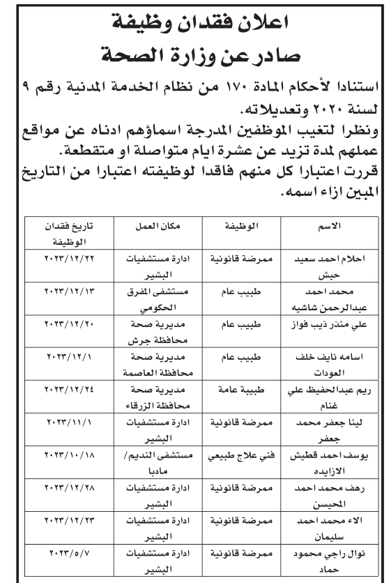 أعلنت وزارة الصحة، واستنادا لأحكام المادة 170 من نظام الخدمة المدنية، أن التالي أسماؤهم فاقدين لوظائفهم اعتباراً من التاريخ المبين إزاء اسم كل منهم.