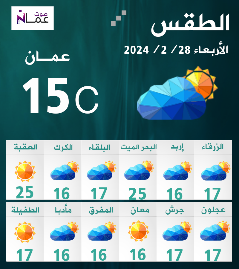 تستمر الأجواء باردة نسبياً اليوم الأربعاء في أغلب مناطق الأردن، ومائلة للدفء في الأغوار والبحر الميت والعقبة، مع ظهور الغيوم على ارتفاعات عالية، والرياح شرقية معتدلة السرعة.