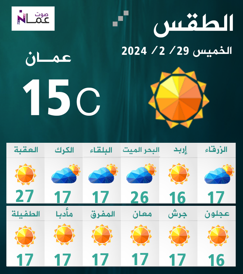 تبقى الأجواء باردة نسبياً اليوم الخميس في أغلب مناطق الأردن، ودافئة نسبياً في الأغوار والبحر الميت والعقبة، والرياح جنوبية شرقية معتدلة السرعة تنشط على فترات.