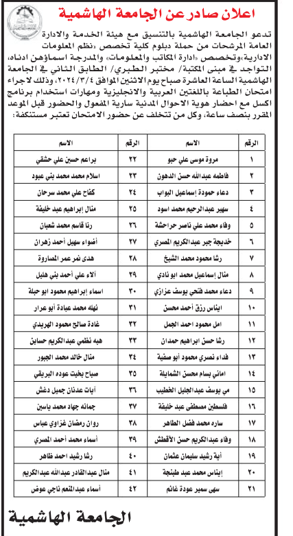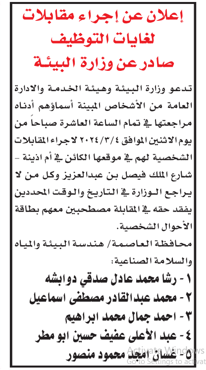 كما دعت عددا من المرشحين لإجراء المقابلات الشخصية وحضور الامتحان التنافسي واستكمال إجراءات التعيين.