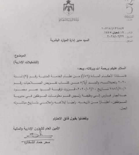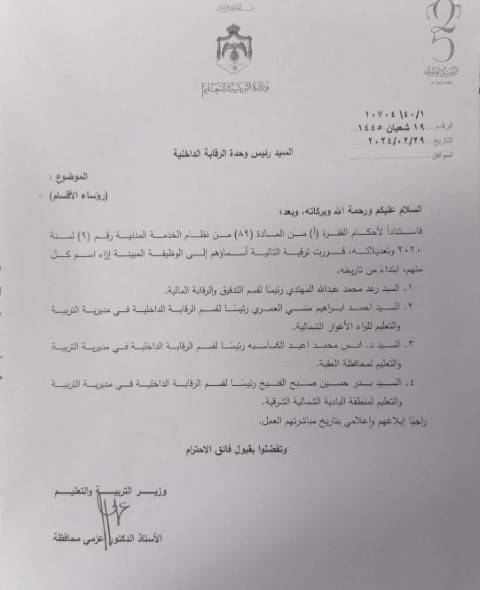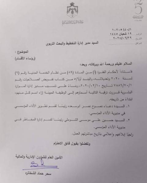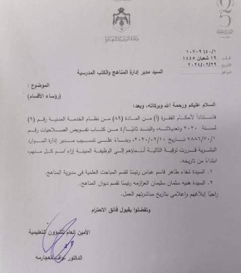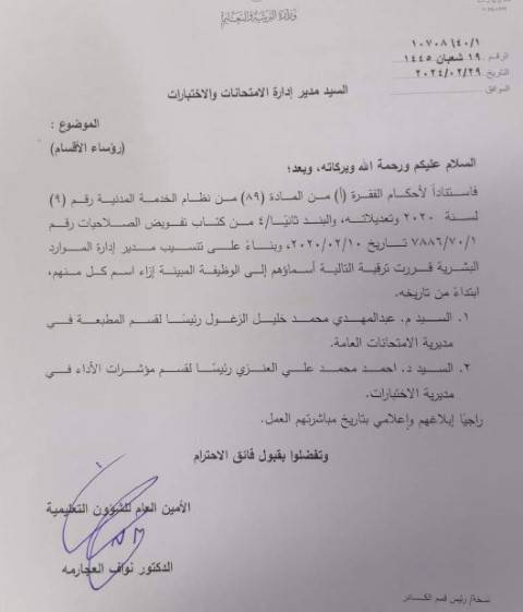 قررت وزارة التربية والتعليم، ترقية عدد الموظفين إلى رؤساء أقسام في عدد من المديريات.