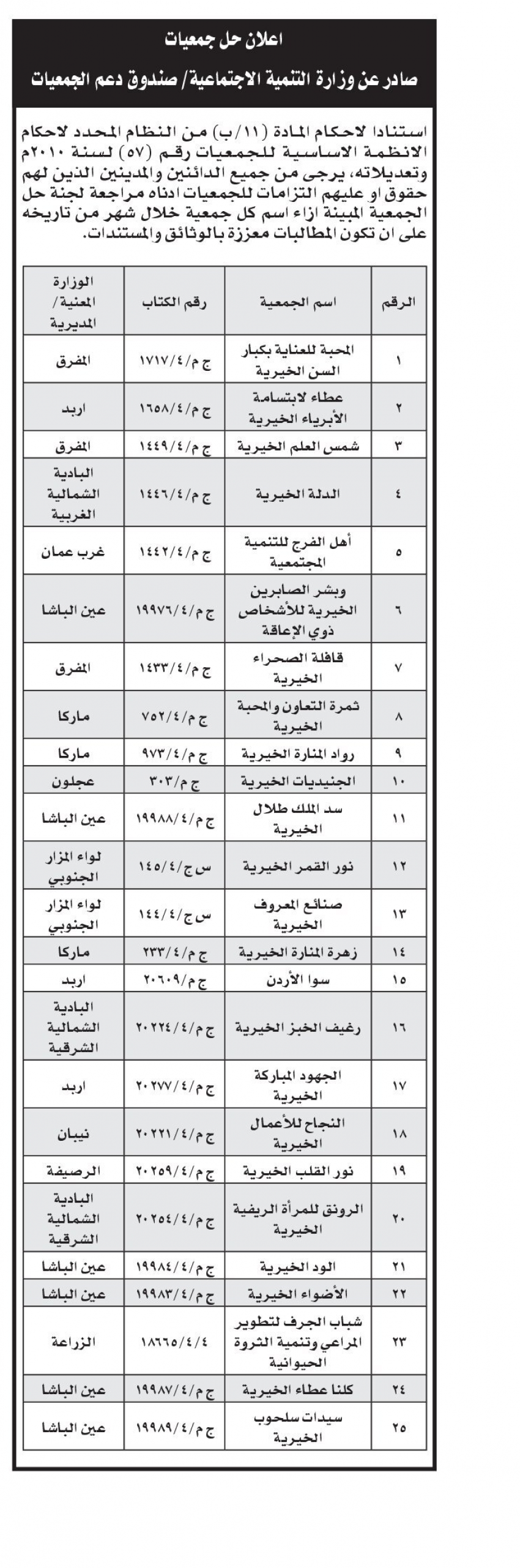 ودعت وزارة التنمية، الدائنين والمدينين الذين لهم حقوق أو عليهم التزامات للجمعيات أناه مراجعة لجنة حلّ الجمعية المبينة إزاء كل جمعية خلال شهر من تاريخه.