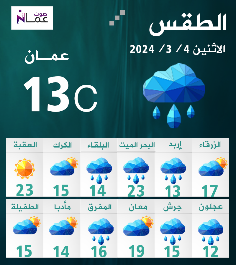 تكون الأجواء اليوم الاثنين باردة نسبياً في أغلب مناطق الأردن، ومائلة للدفء في الأغوار والبحر الميت والعقبة، مع ظهورالغيوم على ارتفاعات منخفضة، ويتوقع هطول زخات متفرقة من المطر على فترات في شمال المملكة وأجزاء من المناطق الوسطى، والرياح شمالية غربية معتدلة السرعة.
