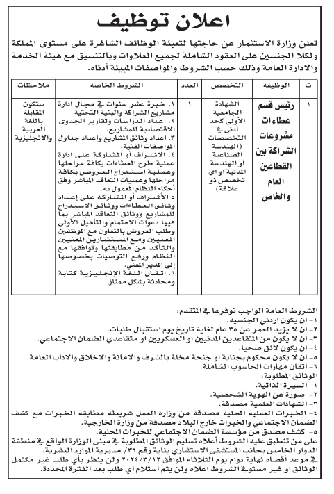 أعلنت وزارة الاستثمار عن حاجتها لتعبئة شاغر رئيس قسم عطاءات مشروعات الشراكة بين القطاعين العام والخاص.