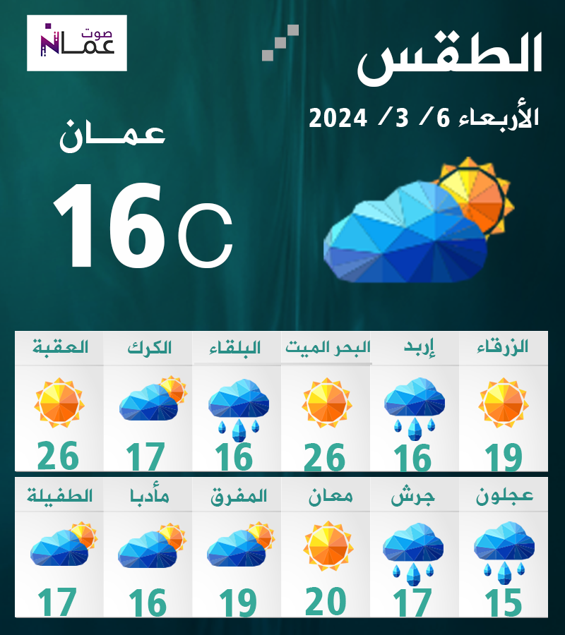 تكون الأجواء اليوم الأربعاء، لطيفة الحرارة في أغلب المناطق، ودافئة في الأغوار والبحر الميت والعقبة، مع ظهور بعض الغيوم على ارتفاعات منخفضة، والرياح جنوبية غربية معتدلة السرعة تنشط بعد الظهر وتكون مثيرة للغبار خاصة في مناطق البادية.