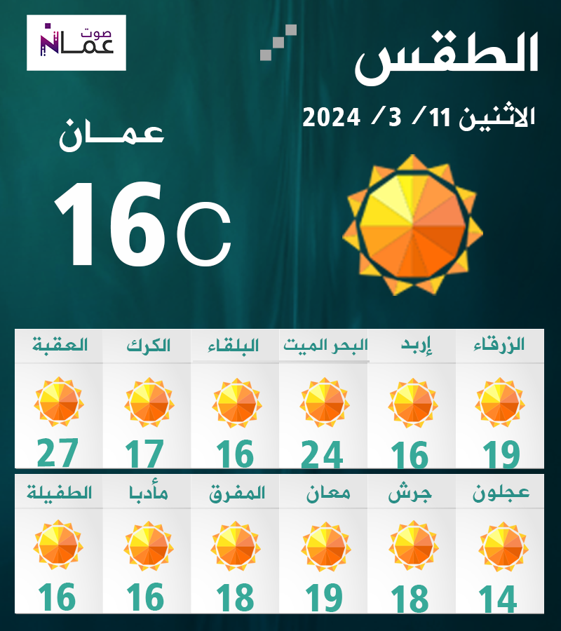 تكون الأجواء اليوم الاثنين، لطيفة الحرارة في أغلب مناطق الأردن، ودافئة نسبياً في الأغوار والبحر الميت والعقبة، والرياح شمالية شرقية خفيفة السرعة.