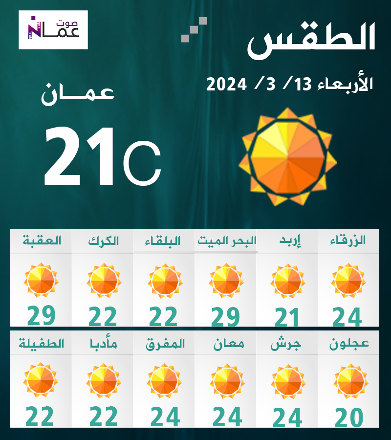 تستمر اليوم الأربعاء، الأجواء دافئة نسبياً في أغلب مناطق الأردن، وأكثر دفئاً في الأغوار والبحر الميت والعقبة، والرياح جنوبية شرقية معتدلة السرعة تتحول بعد الظهر إلى جنوبية غربية.