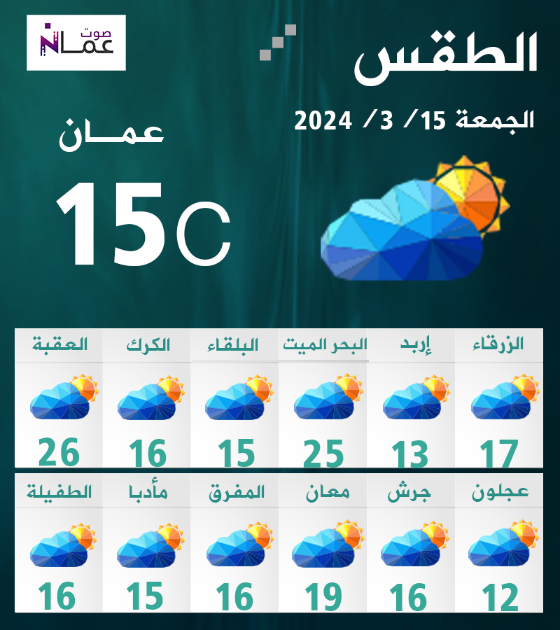تكون الأجواء اليوم الجمعة، باردة نسبياً في أغلب مناطق الأردن، ودافئة في الأغوار والبحر الميت والعقبة، مع ظهور الغيوم على ارتفاعات منخفضة في شمال ووسط المملكة.
