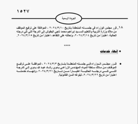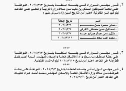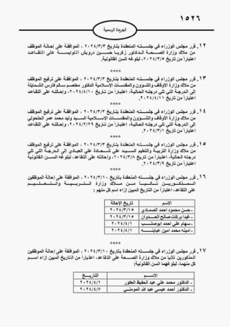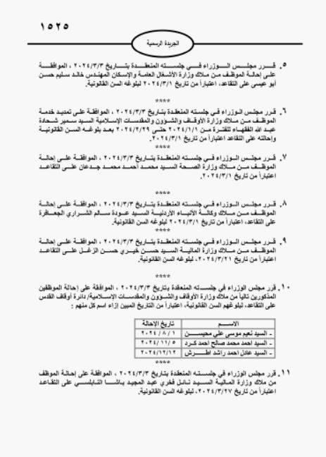 صدر في عدد الجريدة الرسمية، اليوم الأحد،الموافقة على قرار مجلس الوزراء المتضمن الموافقة على إحالة موظفين من وزارة التربية والتعليم والأشغال العامة والإسكان ووزارة الأوقاف والشؤون والمقدسات الاسلامية ودائرة أوقاف القدس ووزارة الصحة ووزارة المالية ووكالة الانباء الاردنية " بترا" وسلطة المياه، إلى التقاعد بناءً على رغبتهم أو وصولهم إلى السن القانوني.
