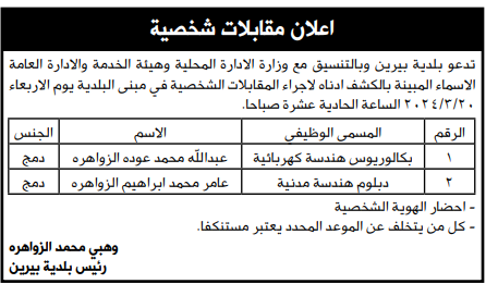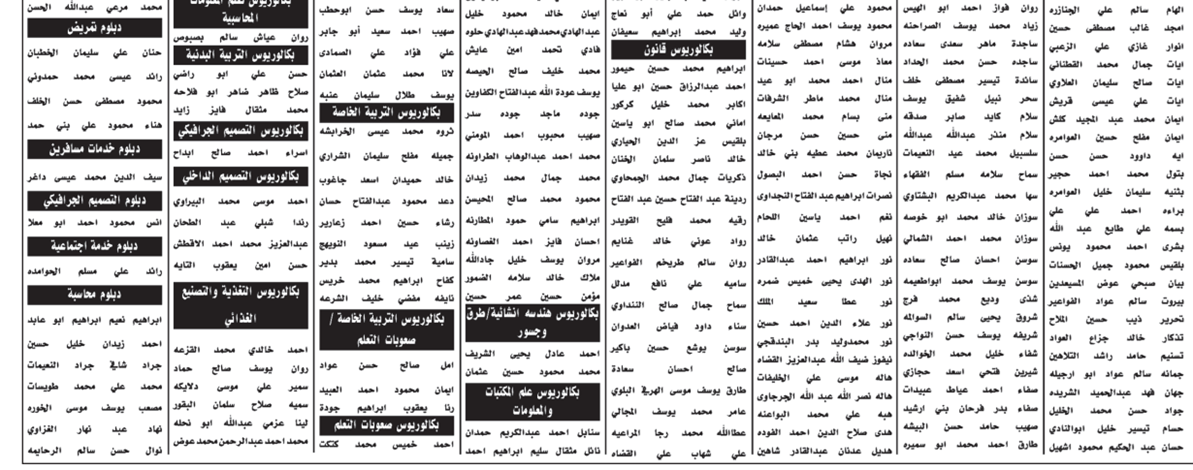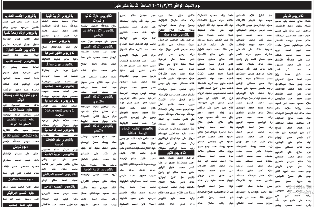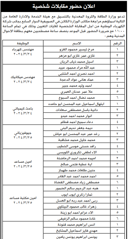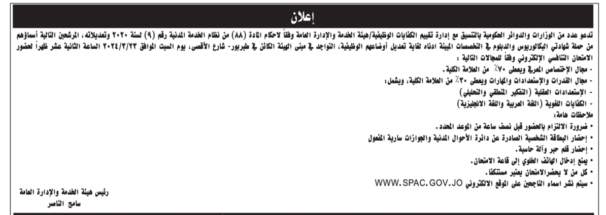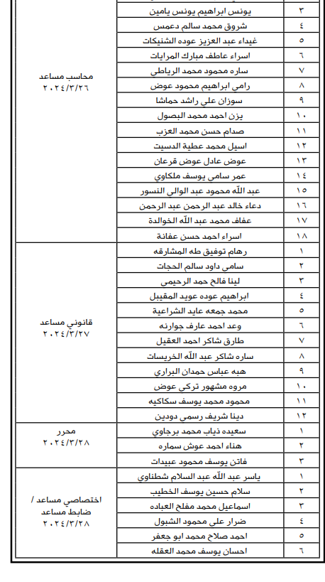 دعا ديوان الخدمة المدنية بالتعاون مع مختلف الوزارات والمؤسسات الحكومية، التالية اسماؤهم لاجراء المقابلات الشخصية وعقد الامتحان التنافسي لغايات التعيين.