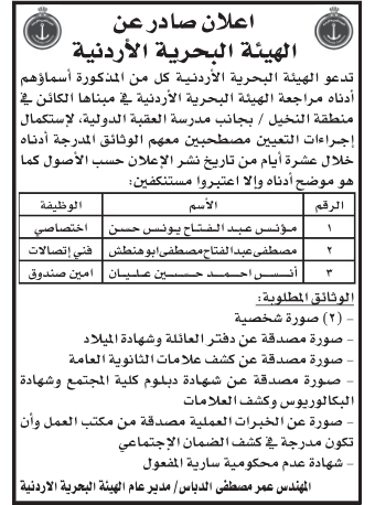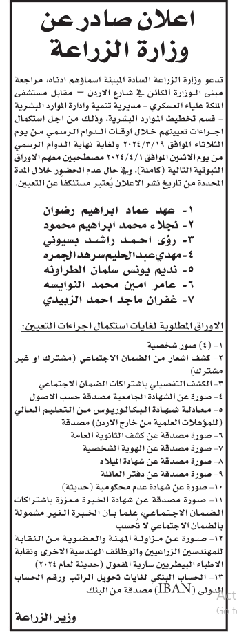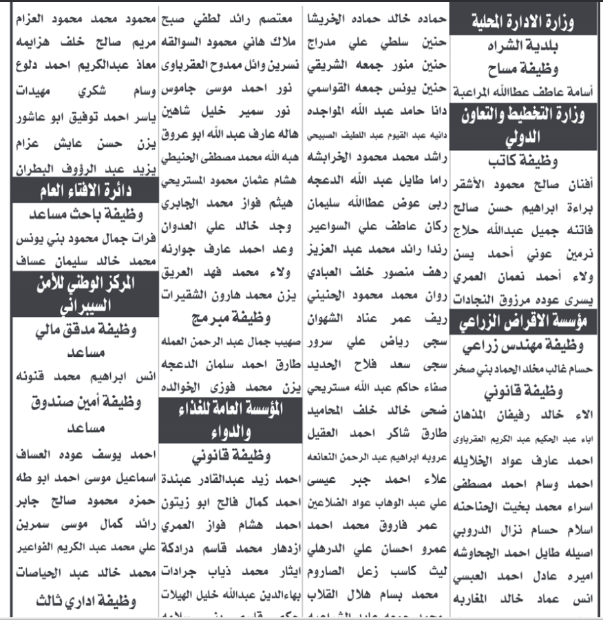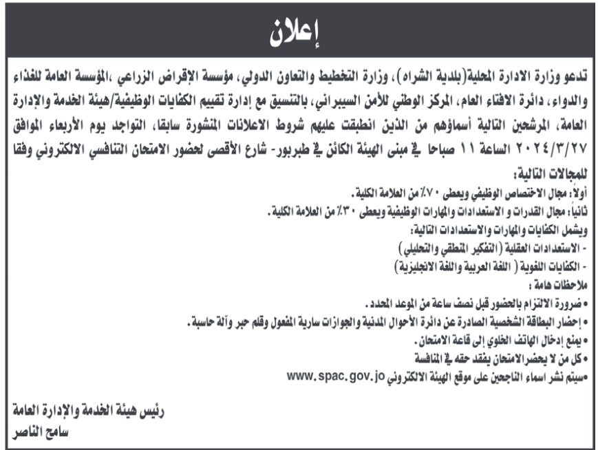 وجهت هيئة الخدمة والادارة العامة وبالتعاون مع وزارات ومؤسسات الحكومية، دعوة لأشخاص لإجراء المقابلات الشخصية لغايات استكمال إجراءات التعيين.