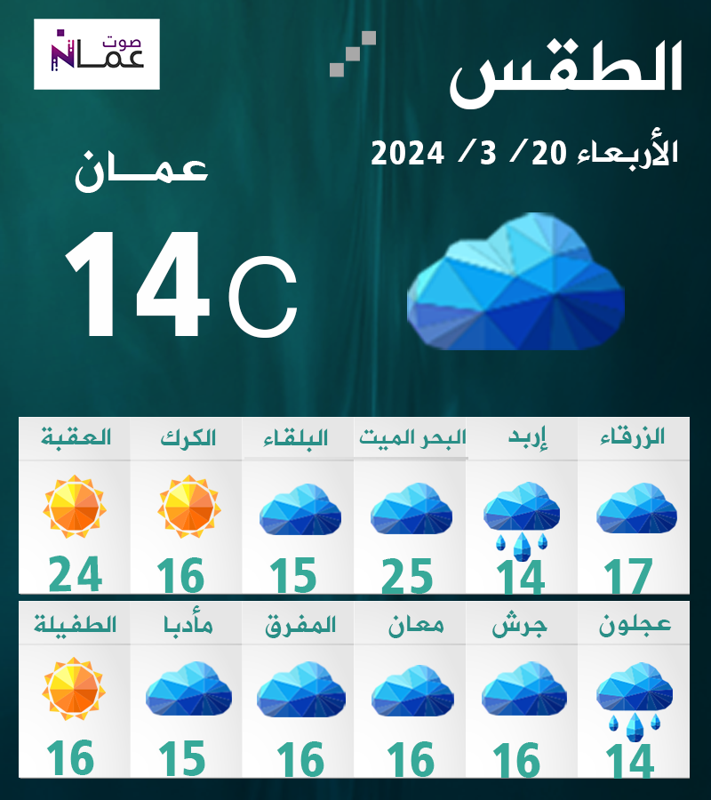 ترتفع درجات الحرارة قليلاً اليوم الأربعاء، وتسود أجواء باردة نسبياً في أغلب مناطق الأردن، ومائلة قليلاً للدفء في الأغوار والبحر الميت والعقبة، مع ظهور الغيوم على ارتفاعات منخفضة خاصة في شمال ووسط المملكة، وهنالك فرصة في ساعات الصباح لهطول زخات متفرقة من المطر في شمال المملكة وأجزاء محدودة من المناطق الوسطى، والرياح جنوبية غربية الى غربية معتدلة السرعة تنشط على فترات.