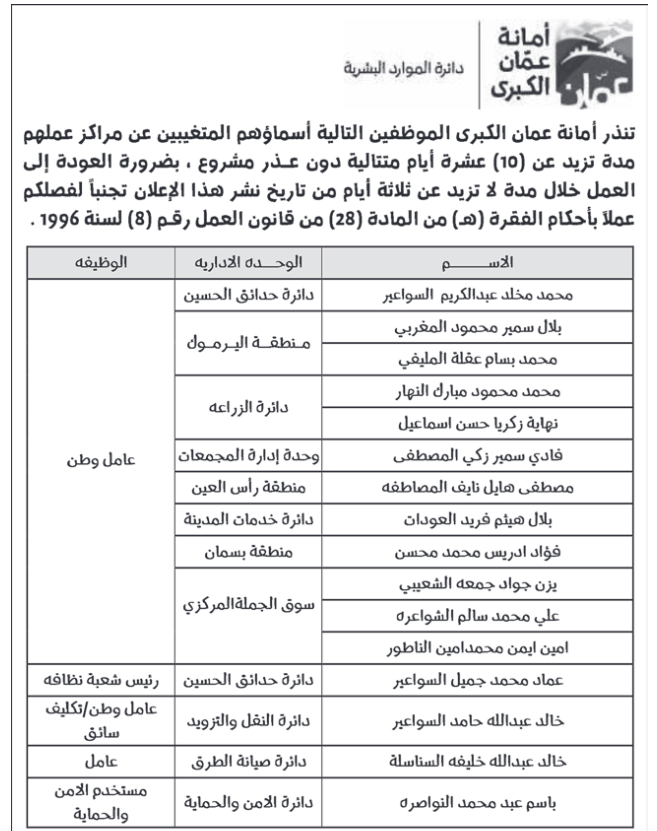 أعلنت أمانة عمان الكبرى عن أسماء موظفين فاقدين لوظائفهم.