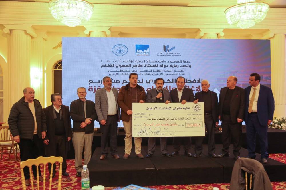 أعلن نقيب المقاولين المهندس أيمن الخضيري عن تبرع النقابة وهيئتها العامه بمبلغ 215 ألف دولار، لصالح حساب اللجنة العليا للإعمار في فلسطين، وذلك حصيلة ما تم جمعه من المقاولين "نشامى الأردن" المخلصين لوطنهم ولمليكهم ولقضيتهم الأولى فلسطين وذلك بهدف تعزيز صمود الأشقاء في غزة بوجه عدوان الاحتلال الصهيوني.