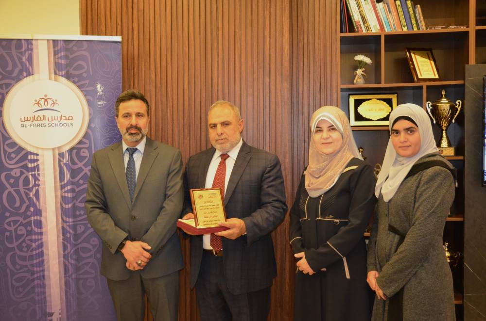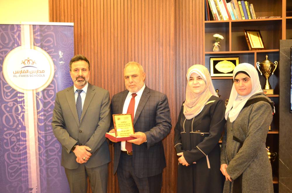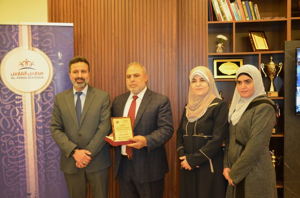 كرم رجل الأعمال المهندس إبراهيم الخليف المناصير ورئيسة جمعية عطاء للريادة والتمكين الدكتورة رندة العمايرة، مدير مدارس الفارس الذكي الدكتور علي عفانة وذلك تقديراً لجهوده.