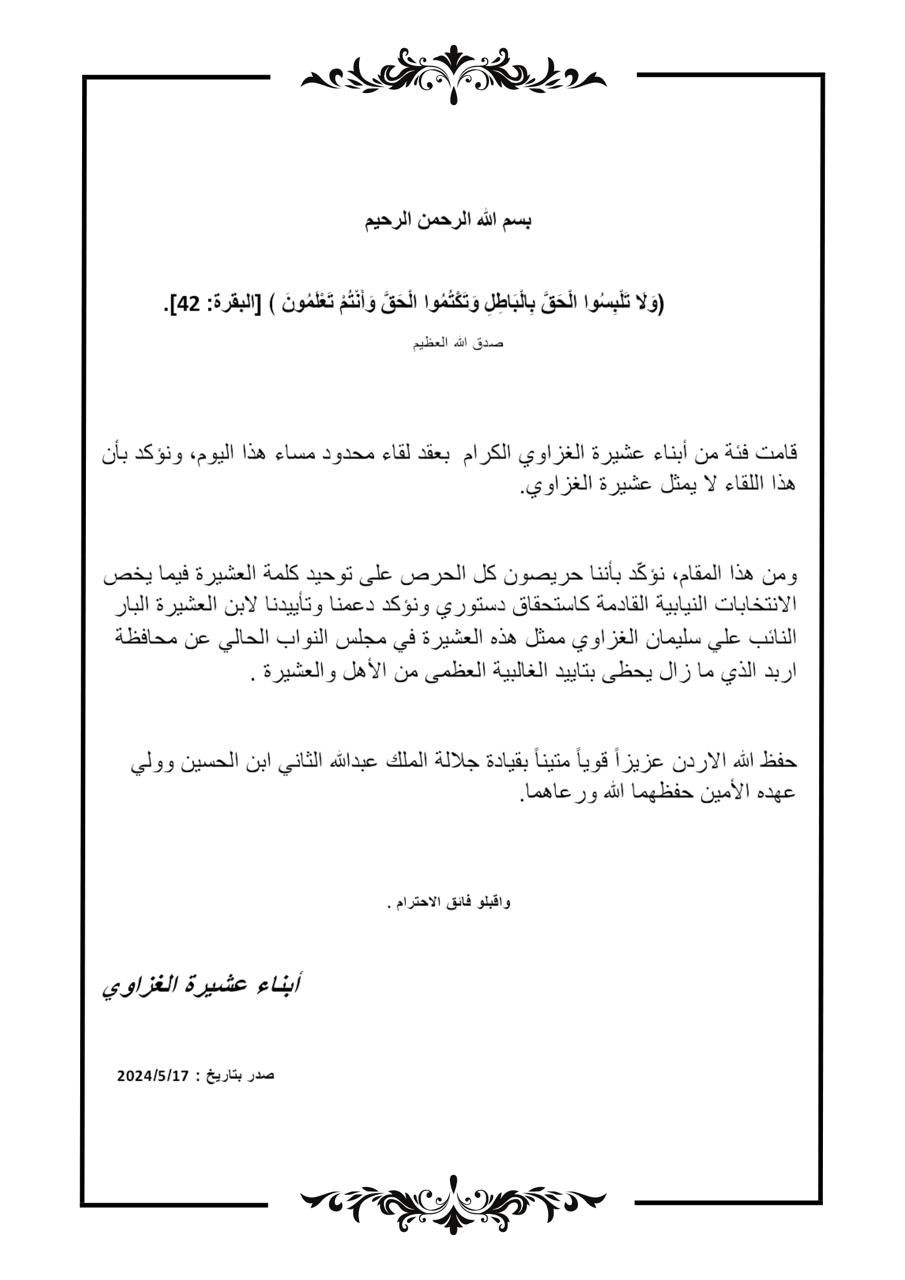 ومن هذا المقام، نؤكّد بأننا حريصون كل الحرص على توحيد كلمة العشيرة فيما يخص الانتخابات النيابية القادمة كاستحقاق دستوري ونؤكد دعمنا وتأييدنا لابن العشيرة البار النائب علي سليمان الغزاوي ممثل هذه العشيرة في مجلس النواب الحالي عن محافظة اربد الذي ما زال يحظى بتاييد الغالبية العظمى من الأهل والعشيرة .