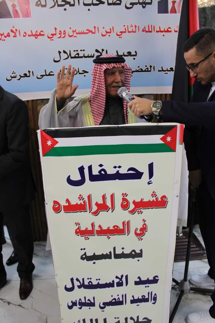 أقامت عشيرة المراشدة في العبدلية / منطقة أحدّ يوم الخميس الموافق ٢٣/٥/٢٠٢٤احتفالاً بمناسبة عيد الاستقلال والعيد الفضي لجلوس جلالة الملك عبدالله الثاني ابن الحسين وتحت رعاية عطوفة متصرف لواء سحاب الأكرم حضرة شيوخ ووجهاء العشائر وأهالي المنطقه وتم إلقاء الكلمات بهذة المناسبة الوطنيّة والتي استذكرت فيها صانع الأستقلال الملك عبدالله الأول وحماة الاستقلال الغُر الميامين من بني هاشم ، ونهضة الأردن الحديثة بقيادة الملك عبدالله الثاني ابن الحسين ، ومنذ تولية سلطانه الدستورية وهو يدافع عن قضايا الأمة العربية وفي مقدمتها القضية الفلسطينية ونحن نحتفل بعيد جلوسة الفضي على العرش ، وبهذة المناسبة الوطنية يجدد أبناء عشيرة المراشدة البيعة والولاء للعرش الهاشمي بقيادة جلالة الملك عبدالله الثاني ابن الحسين وولي عهدة المحبوب ، ونسأل المولى عز وجل أن يحفظ ألاردن وشعبه وقيادتة الهاشمية