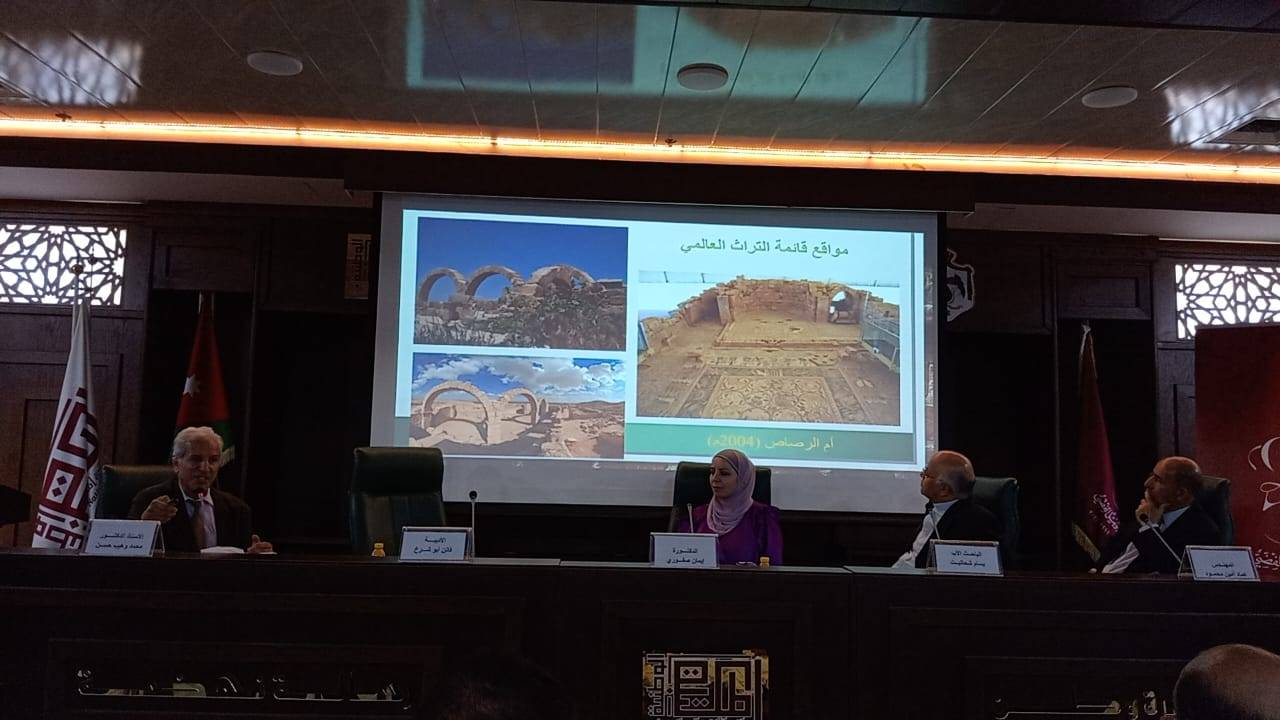 وفي مداخلتها، الباحثة ايمان، قدمت ورقة حول اكتشافات أثرية أردنية، ام الجمال كنز من كنوز الباذية الشمالية الشرقية، وقالت؛ ان الاكتشافات الأثرية في الأردن تقدم لمحة عن النسيج الغني للتاريخ البشري وتعرض ترابط الحضارات والارث الدائم لأسلافنا، وهنا اسعدنا كثيرا ان تتبوأ ام الجمال موقعها على قائمة التراث العالمي لليونسكو، جوهرة الصحراء السوداء، هذه المدينة الآسرة وموقع اثري يقع في محافظة المفرق شمال شرق الأردن، يمتد تاريخها إلى عدة آلاف من السنين، من العصر النبطي، البيزنطي، والفترات الإسلامية المبكرة، شيدت باستخدامها المبتكر لمواد البناء ذات الأساس البركاني مثل حجر البازلت والسكوريا بالإضافة إلى المواد الاسمنتية ذات الأساس الجيري، يضيف المزيد من الحصرية إلى أهمية الموقع الأثرية، التي تعد إحدى المدن العشر من مدن الديكابولس، وأهم محطات القوافل التجارية النبطية القديمة بصرى، وساهم الأمويين في نموها وتطورها بإنشاء هياكل عسكرية ومدنية ودينية في القرن الرابع الميلادي، وهي مركز للسفر والضيافة لأكثر من 1700عام، تصميمها المعماري يشير إلى نشاط نابض بالحياة ونسيج تاريخي غني بالحضارة.