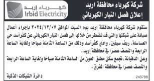 تعتزم شركة كهرباء إربد، إجراء فصل مبرمج للتيار الكهربائي اليوم السبت، عن مناطق محدودة في محافظتي إربد والمفرق لغايات الصيانة وتحسين جودة الشبكات.