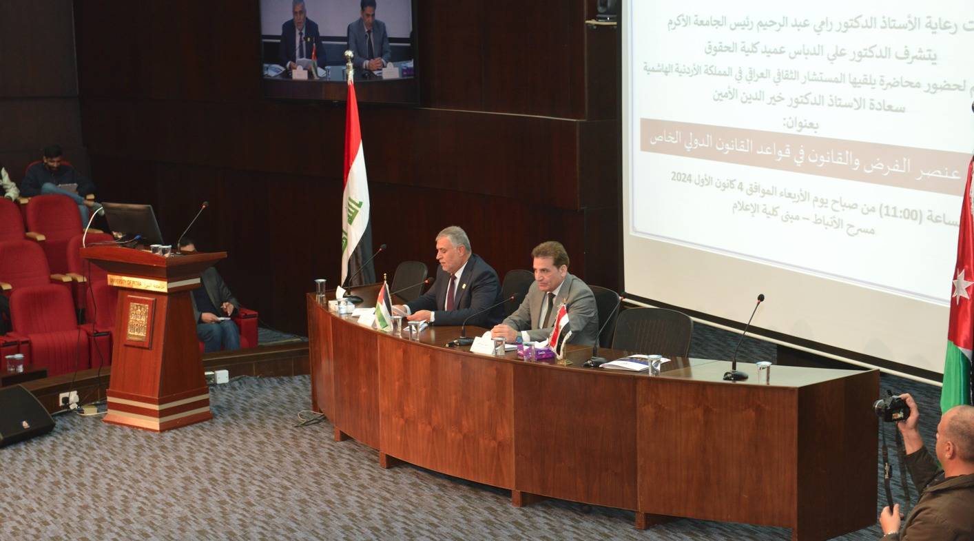 استضافت كلية الحقوق في جامعة البترا محاضرة للمستشار الثقافي لجمهورية العراق في المملكة الأردنية الهاشمية الأستاذ الدكتور خير الدين الأمين، بعنوان: "تطور عنصر الفرض والقانون في قواعد القانون الدولي الخاص" على مسرح الأنباط في كلية الإعلام، حضرها رئيس الجامعة الأستاذ الدكتور رامي عبد الرحيم، وعدد من العمداء، ومديري الدوائر الإدارية، وطلبة الجامعة.