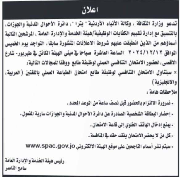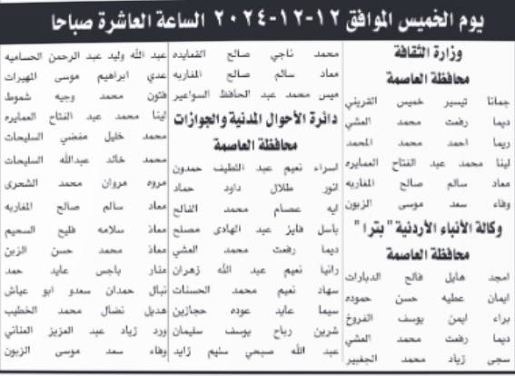 وجهت عدد من الدوائر الحكومية اليوم الاثنين، دعوة للمرشحين، وذلك لغايات حضور الامتحان التنافسي والمقابلة الشخصية لغايات التعيين .