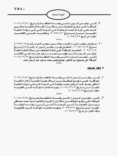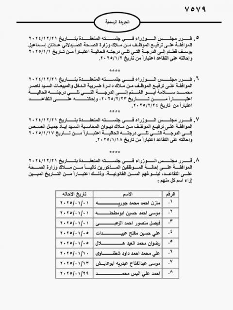 صدر في عدد الجريدة الرسمية اليوم الثلاثاء، قرارات مجلس الوزراء بإحالة عدد من موظفي الدولة إلى التقاعد، وانهاء خدمات آخرين.