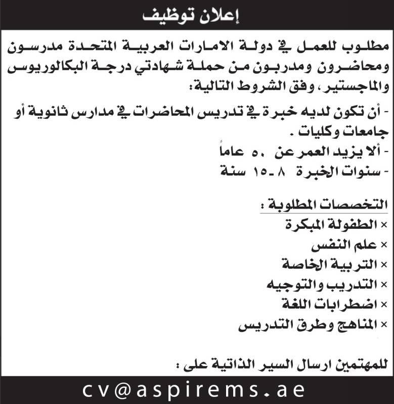 أعلنت دولة الامارات عن حاجتها لتعيين مدرسين ومحاضرين ومدربين من الجنسية الأردنية من حملة شهادتي درجة البكالوريوس والماجستير، وفقاً للشروط التالية: